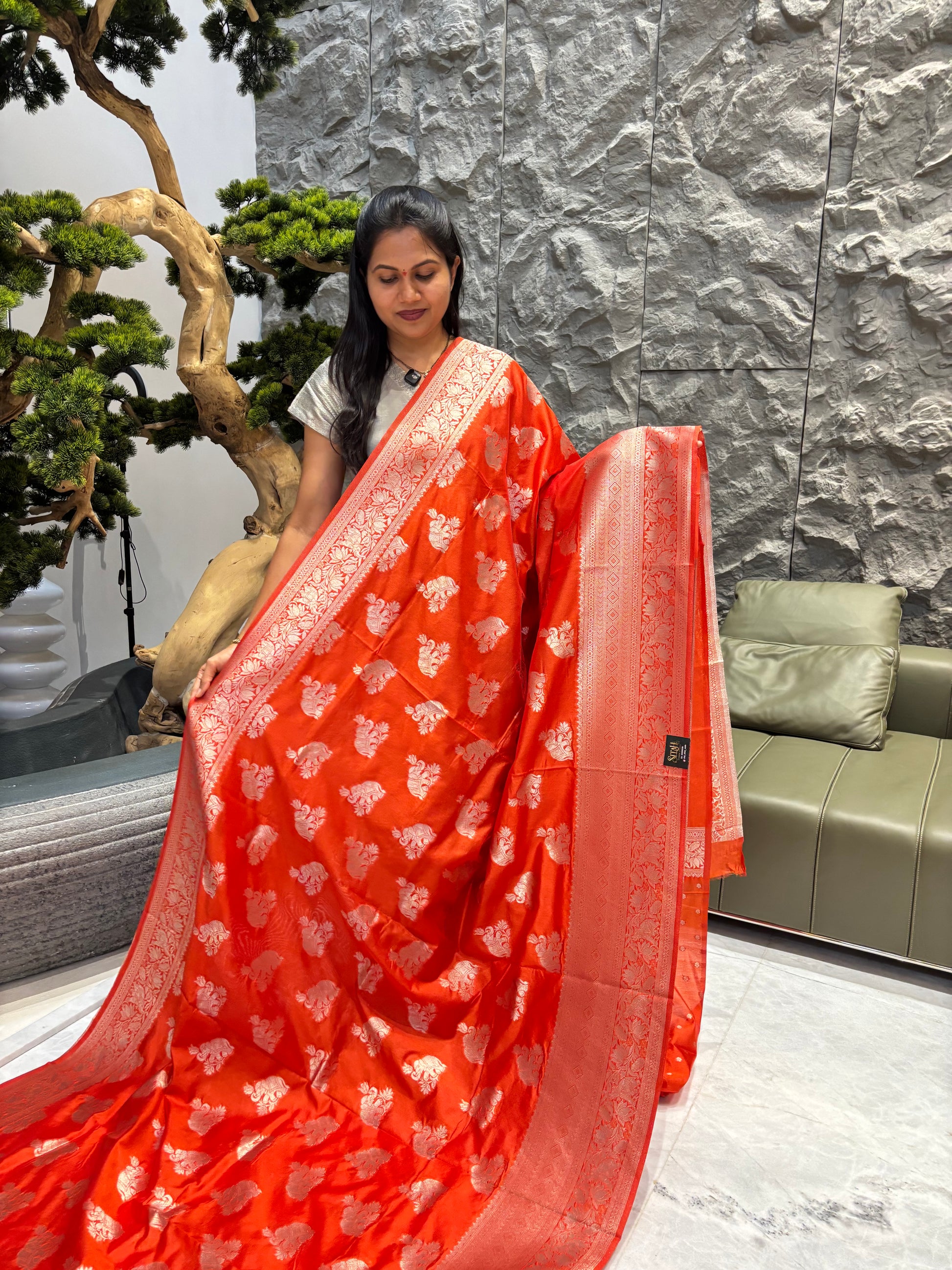 Orange fancy silk saree with kanchi style borders and self buti blouse