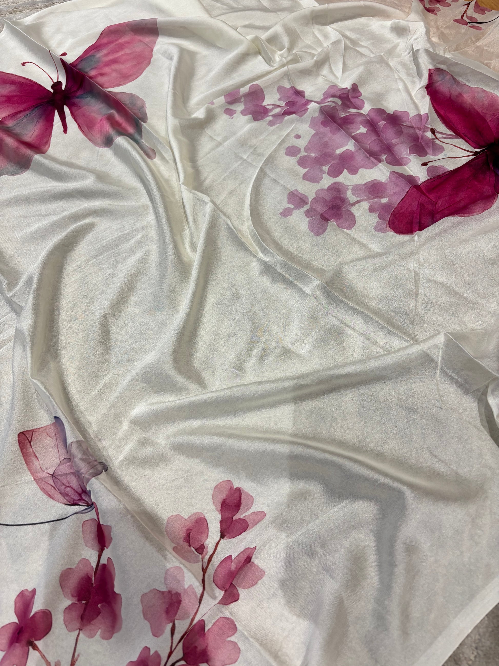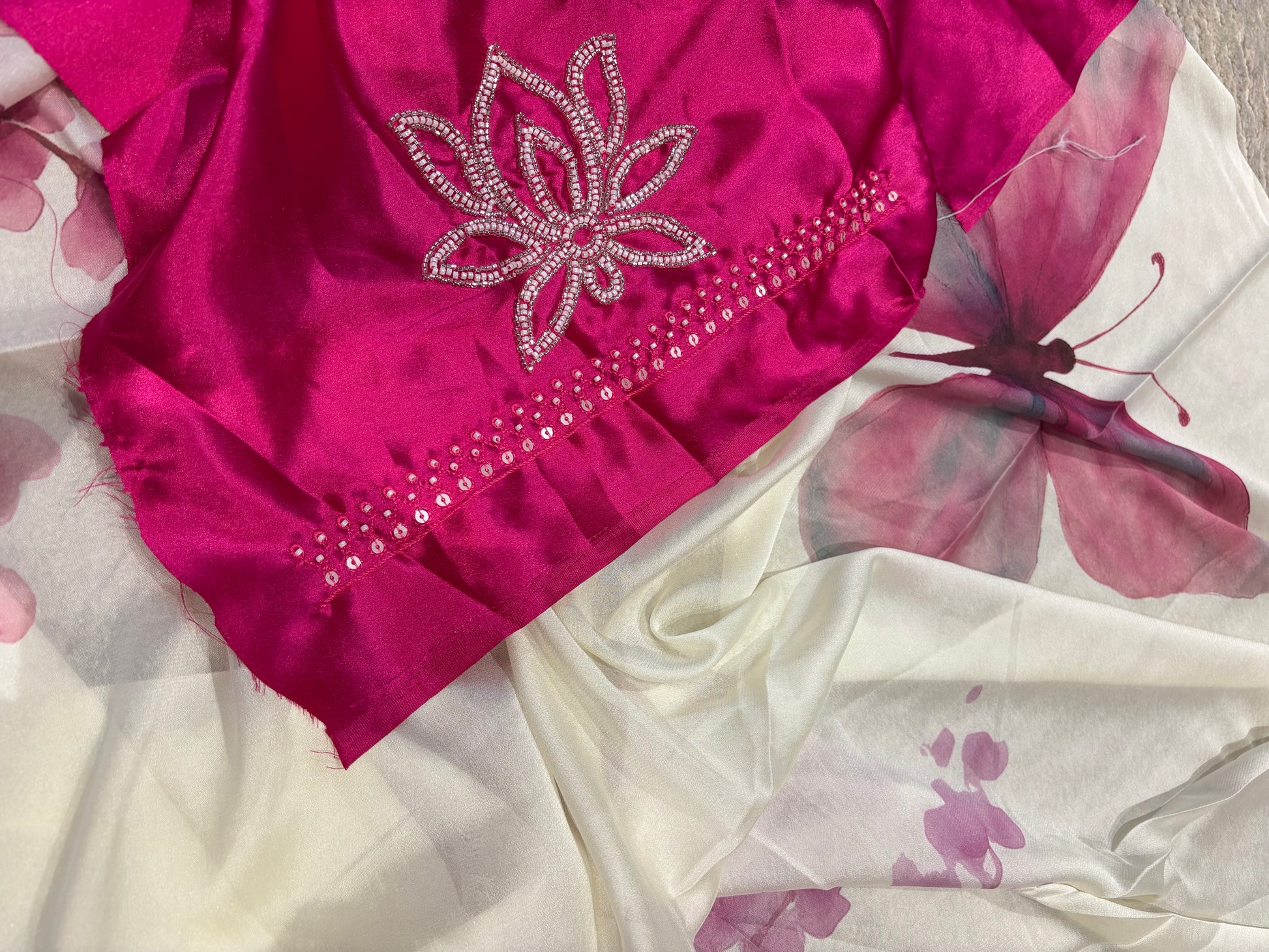 Vanilla shade georgette saree adorned with pink floral print and butterfly design. Paired up with handwork blouse.