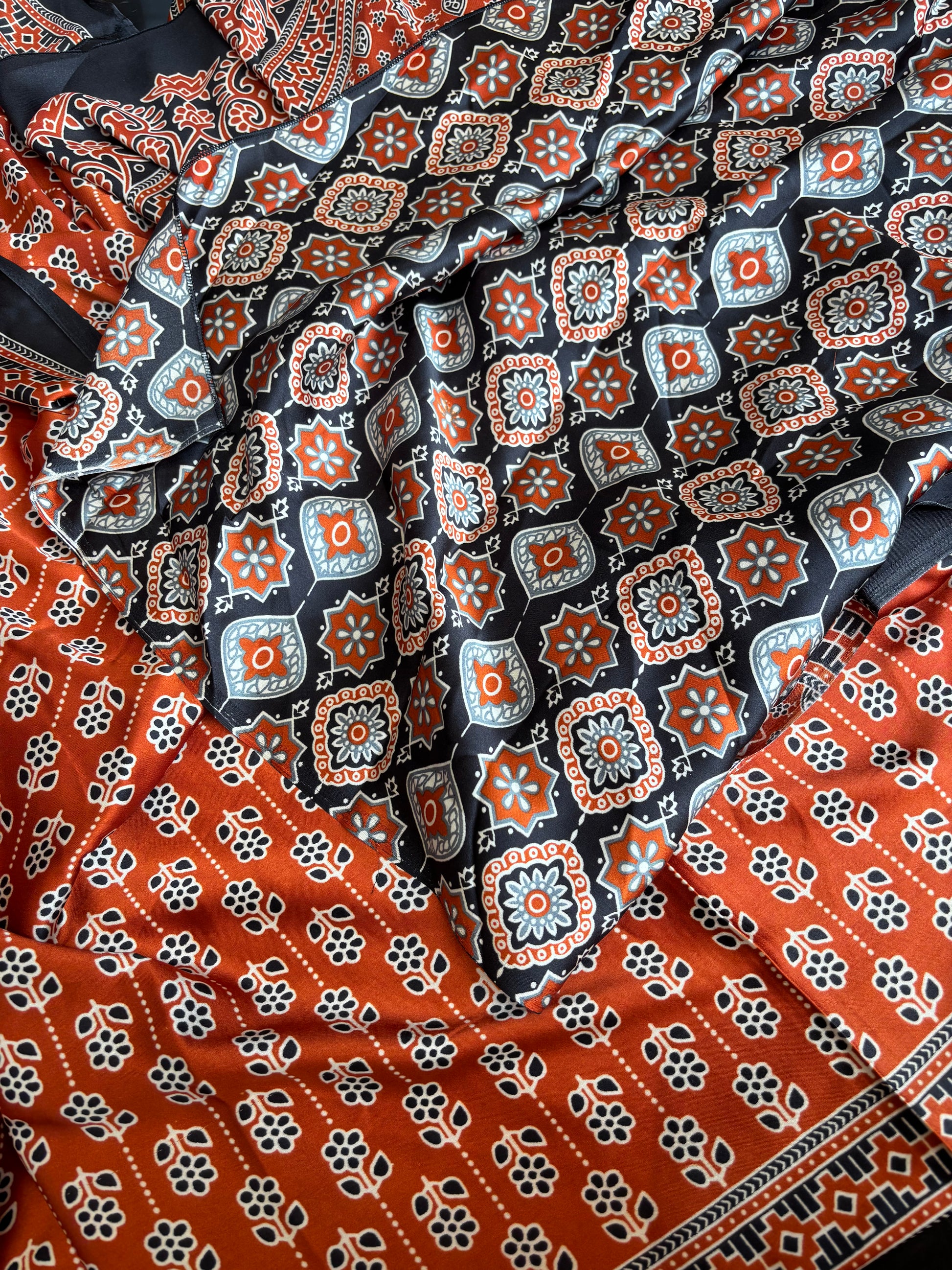 Rust shaded ajrakh printed modal silk sarees with ajrakh pallu and printed black blouse.